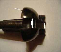 The next item we will address is the bolt. First, we want to make sure the bolt will fit into each bolt notch in the cylinder. This is done using a caliper. Measure the width of the bolt (that round hump that sets on top) ... then using the caliper measure bolt notch width in the cylinder. The bolt should be less than the cylinder bolt notches. Measure all six notches. If the bolt does not have a smaller measurement, remove metal from the bolt on both sides to get it to fit into the cylinder notches. Once this is done, check the angle of the bolt hump. It should be slanted as seen in the picture below. It is slanted this way so that when the cylinder turns when the hammer goes to half cock the bolt drops, and as you go to full cock the bolt starts to rise and engage the ramp that precedes the cylinder notch. At full cock the bolt should lock the cylinder bank vault tight. If it is not doing this then there is a problem with the hand.