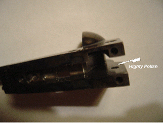 The next part we will work on is Hammer. We want to highly polish the sides of the hammer and the curve of the hammer that enters the hammer channel to the frame. Most of the hammers will have a detent where the arbor tip meets the hammer channel. We want to remove this detent and highly polish the hammer. Check the half and full cock notches on the hammer to make sure there are no burrs in these cuts. Do not polish or change any of the sear notches on the hammer. The sear is that round cut wedge on the lower left side of the hammer. Just check the sear to make sure it does not have any burrs on it. Lightly rub it with 400 grit sandpaper. When polishing the hammer sides, you will be removing the case hardening color. We will talk later this. If you look at the hammer face that strikes the cap you will see a slot cut in the hammer face, fill this slot with JB Weld and let dry for at least 24 hours. Once the JB Weld is dry we want to file the face down so that it is about .001” to .003” from the cap when the trigger is pulled. You will make this adjustment after reassembly of the revolver.