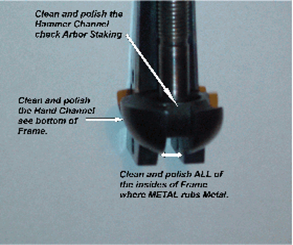 After cleaning the revolver completely. Do the following: Take a pair of old panty hose and check parts for burrs and rough-cut machine marks. Use a flat Diamond File and Clean out the hammer well channel. Both Uberti and Pietta, where the arbor is pinned in, will sometimes protrude enough to keep the hammer from seating itself in the hammer channel. Then take the file and lightly dull all the sharp edges of the hammer channel. Cut a piece of wood so that it is just a wee bit smaller than the Hammer Channel and make sure it has a flat side. We will wrap all the different grits of sandpaper on this piece of wood to polish the hammer channel. We will start with 100 grit and work up to 2000 grit for polishing the hammer channel. Cut another piece of wood to fit inside the frame where the hammer rides to include that area of the frame where the two humps are. We want to polish the inside of the frame ridding it of machine marks and burrs. Cut a piece of wood that will fit up into the hand channel (where the hand protrudes beside the arbor) and make sure this wood is a wee bit smaller than the hand channel. Start with 100 grit and work up to 2000 grit for the Hand Channel. While doing this, check to make sure the hand is not hitting the arbor when you cock the revolver. If the hand does hit the arbor, remove metal from the side of the arbor where hand is making contact. Do the same with the sandpaper grits. We want the inside of the frame to be slick. Wherever you have metal rubbing metal, you want these areas to be highly polished.